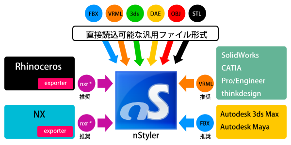 nStylerでは、FBX・VRML(2.0)・OBJ・3ds・STL・DAE形式の3Dデータを読込む事が可能です。また、Rhinoceros・NXの専用プラグイン・エキスポーターを有償オプションとしてリリースしております。専用エキスポータでは、NURBSやPOLYGONの出力形態、マテリアルや階層を継承連動させたnStylerのネイティブファイル(nxr形式)を出力する事が可能となります。