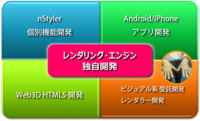 高品位3Dリアルタイム・レンダラー「nStyler」へのUI開発、3DCADとのI/F開発、個別の機能開発などを有償対応致します。また、3DグラフィックスAPI(OpenGL、DirectX)を用いて、ビジュアル要素が含まれているリアルタイム系のソフトウェア、レンダラー開発やX3D、Flash、HTML5等を利用したWeb3D系のソフトウェア開発、Android/iOS等に対応したアプリ開発など、多種多様なお客様のご要求を満たすソフト開発を請け負っております。