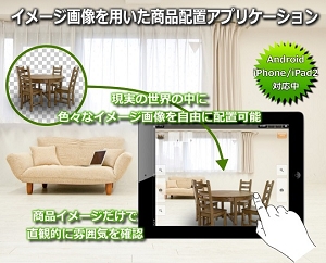 「nPhoto(エヌフォト)」とは、Android、iPhone、iPad2のデバイス画面内に背景を切抜いたPNG画像とnStylerで表示した3Dデータの回転画像の両画像を表示する事が商品画像の配置アプリケーションになります。ARの様なマーカーを必要としない為、色々な状況で商品を配置する事が出来ます。また、取り込める(表示できる)データは、PNG形式の画像になるため、PhotoShopやGIMPなどのイメージ編集ソフトを利用して簡単に製作する事が出来ます。イメージ画像の拡大・縮小、移動、写真撮影、表示商品のリンク(有償サービス)等は誰でも簡単に操作する事が出来ます。マーカー準備や場所を選ばず、すぐその場で直観的にARシミュレーションの様な配置・雰囲気を確認できるアプリケーションです。