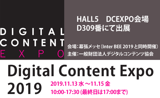 幕張メッセで開催されます、「デジタルコンテンツEXPO(DCEXPO) 2019 」(Inter BEE 2019 と同時開催)に出展いたします。