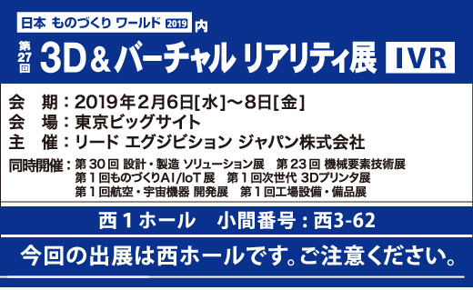 東京ビッグサイトで開催されます、「3D&バーチャルリアリティ展 」(日本ものづくりワールド2019内)に出展いたします。