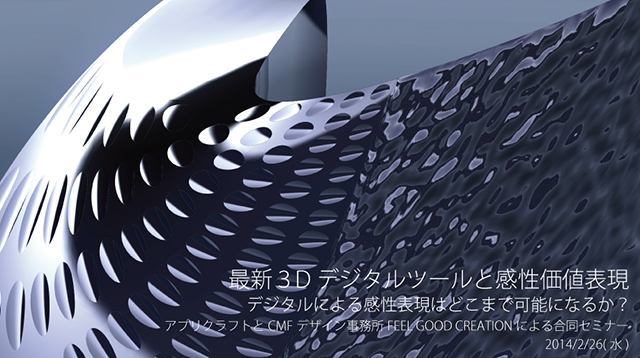 株式会社FEEL GOOD CREATIONと株式会社アプリクラフトは、来る2014年2月26日(水)シースクェア恵比寿において、セミナーを開催いたします。今回のセミナーでは、Rhinocerosの次期バージョンに組み込まれる予定のGrasshopper(グラフィカルアルゴリズムエディター)による新しいデザイン・モデリング手法をご紹介するとともに、最も感性レベルの高い分野と言われるCMFデザインの概要・活用事例をご紹介し、相互の親和性に関して、それぞれエキスパートが新しい創造性を探ります。