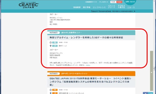 当日は天候が悪い中、本セミナー及びブースに多数のご来場・ご参加を下さいまして誠に有難う御座いました。おかげさまで大変盛況な状態で、CEATEC2013を終了する事が出来ました。これもひとえに皆様のご協力のたまものと深く感謝を致しております。