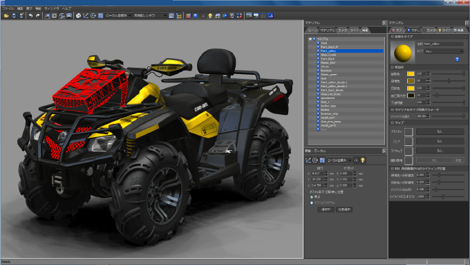 」を含めた合計8タイプのマテリアルから好みのタイプを選択して、カラーや映り込み、ハイライト等の編集や「ノーマル」、「バンプ」、「スペキュラー」などのマッピングの設定を行います。